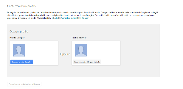 Una volta che hai portato a termine la procedura per la creazione di un account Google ti verrà chiesto se desideri creare o collegare il tuo account Google+ a Blogger (pulsante Crea un profilo Google +) per effettuare la registrazione al servizio, o se creare un profilo su Blogger (pulsante Crea un profilo Blogger limitato). La scelta in questo caso è tua: puoi creare un profilo sul social network di Google oppure semplicemente registrarti a Blogger senza passare per il social network.